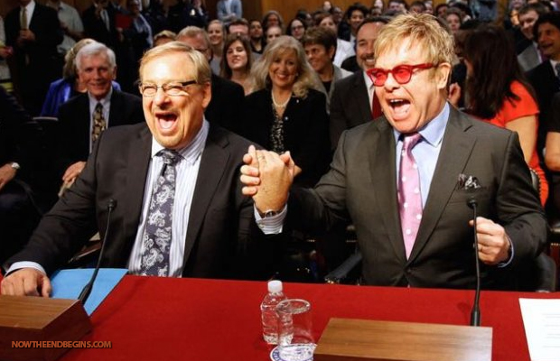 Vaikka se ei ole yllätys, että hartaasti liberaali Korkeimman oikeuden tuomari tukisi homoavioliittoja, se on syvästi huolestuttavaa, että niin monet uskonnolliset hahmot ja järjestöt Yhdysvalloissa ovat puhuneet myönteisesti asian suhteen. Näihin kuuluu kuuluisa megakirkon pastori Rick Warren, joka äskettäin työskenteli rinnakkain homoseksuaalisen laulajan Elton John'in kanssa kun he puhuivat Kongressin edessä. Raporttien mukaan Rick Warren ja Elton John pitivät toisiaan kädestä kiinni tapahtumassa, ja Warren jopa kertoi John'ille, että jos he suutelisivat, niin se olisi ”suudelma joka kuultaisiin ympäri maailman.” (18)